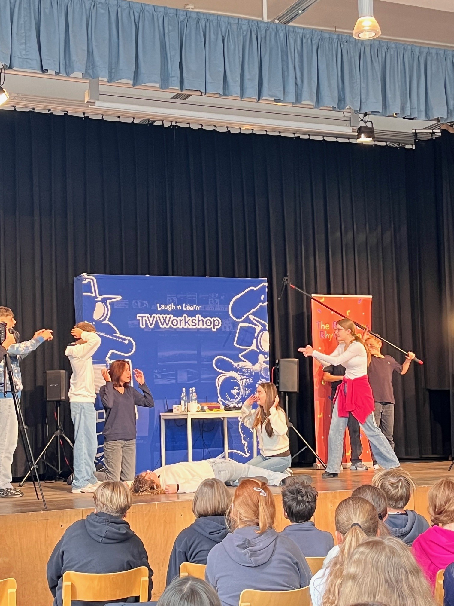 Am Mittwoch, den 15. Oktober 2025 hatten unsere Schülerinnen und Schüler der 7. bis 10. Klassen die großartige Gelegenheit hinter die Kulissen des Fernsehens zu blicken. Der Workshop, konzipiert vom Schauspieler und Produzenten Joe Chambers, bekannt als Schauspieler der BBC, brachte ihnen die Grundlagen einer TV-Produktion spielerisch näher. Die Veranstaltung erwies sich als äußerst unterhaltsam und lehrreich, insbesondere weil sie das Englischlernen unseren Schülerinnen und Schülern auf praktische und ansprechende Weise unterstützte.